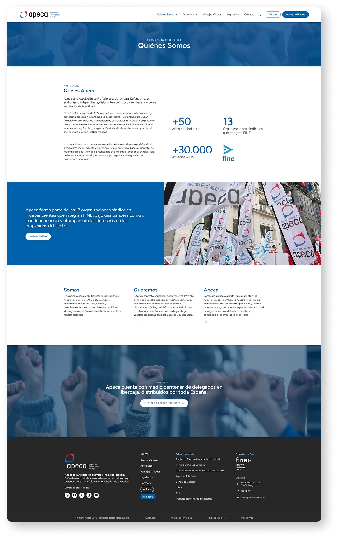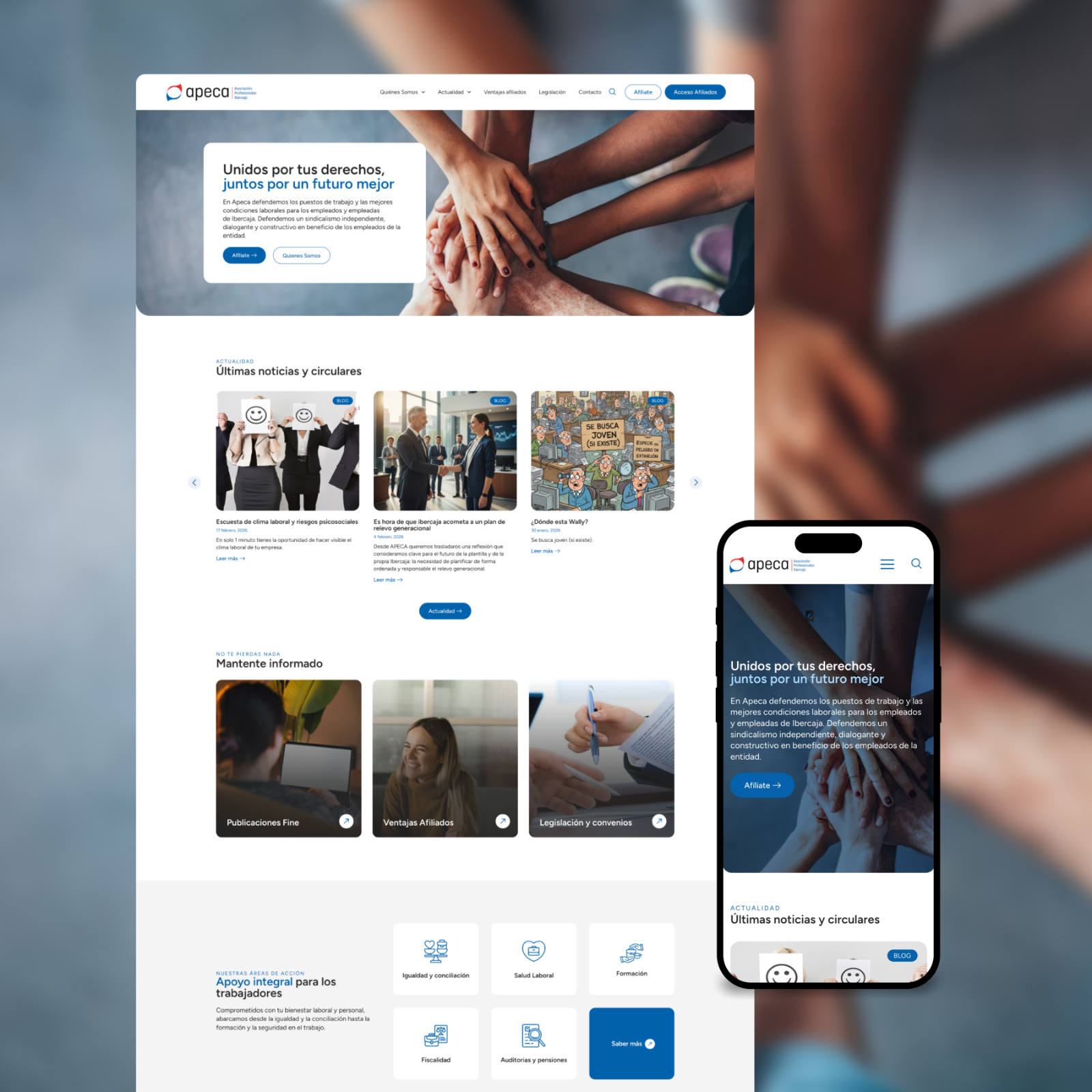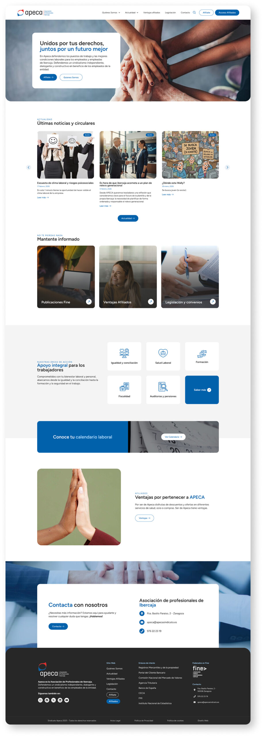 Diseño y desarrollo de la nueva web corporativa de APECA, la Asociación de Profesionales de Ibercaja, con una estructura moderna, clara y accesible que comunica eficazmente su misión de defensa de los derechos laborales y servicios a afiliados.