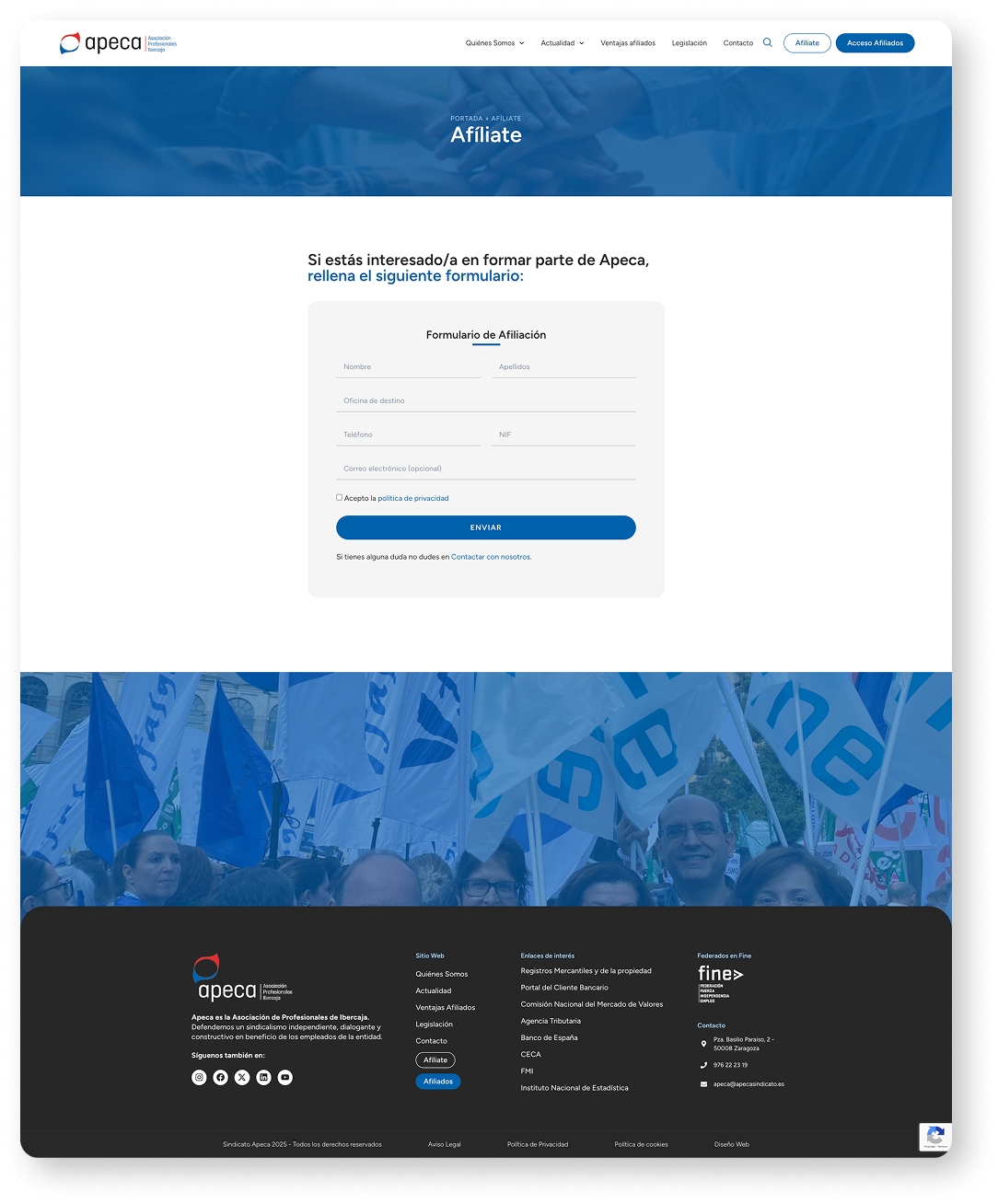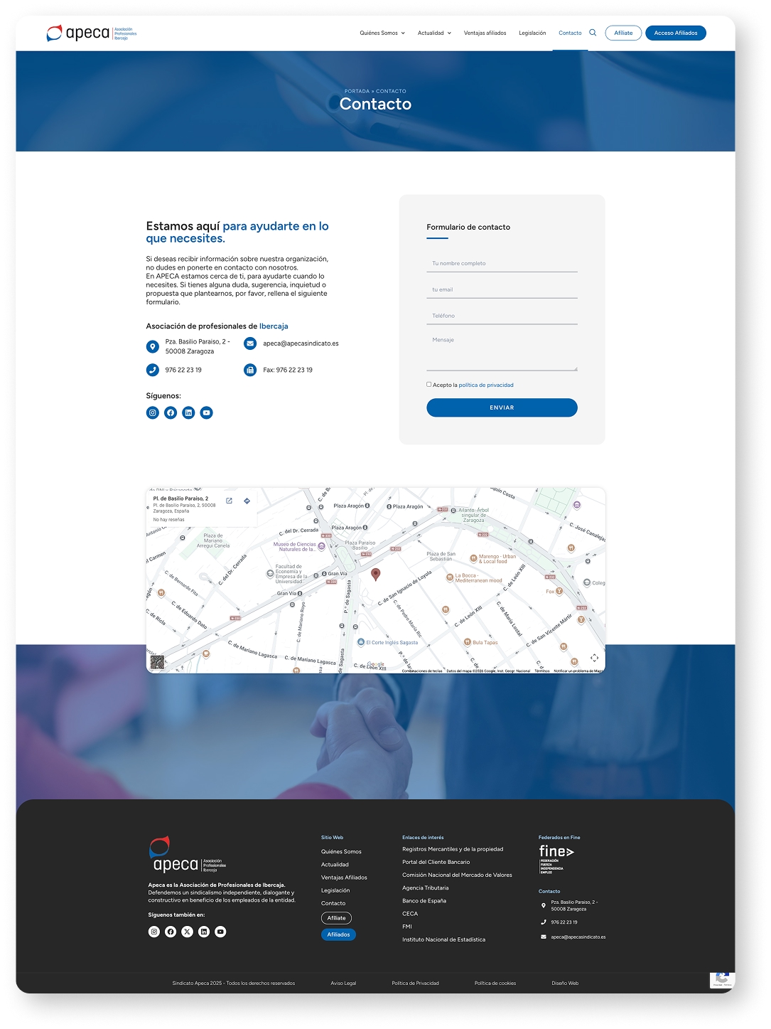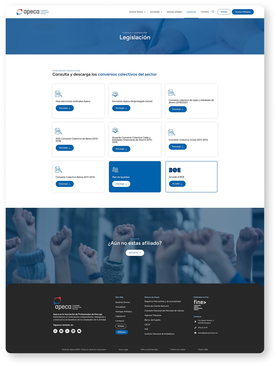 Diseño y desarrollo de la nueva web corporativa de APECA, la Asociación de Profesionales de Ibercaja, con una estructura moderna, clara y accesible que comunica eficazmente su misión de defensa de los derechos laborales y servicios a afiliados.
