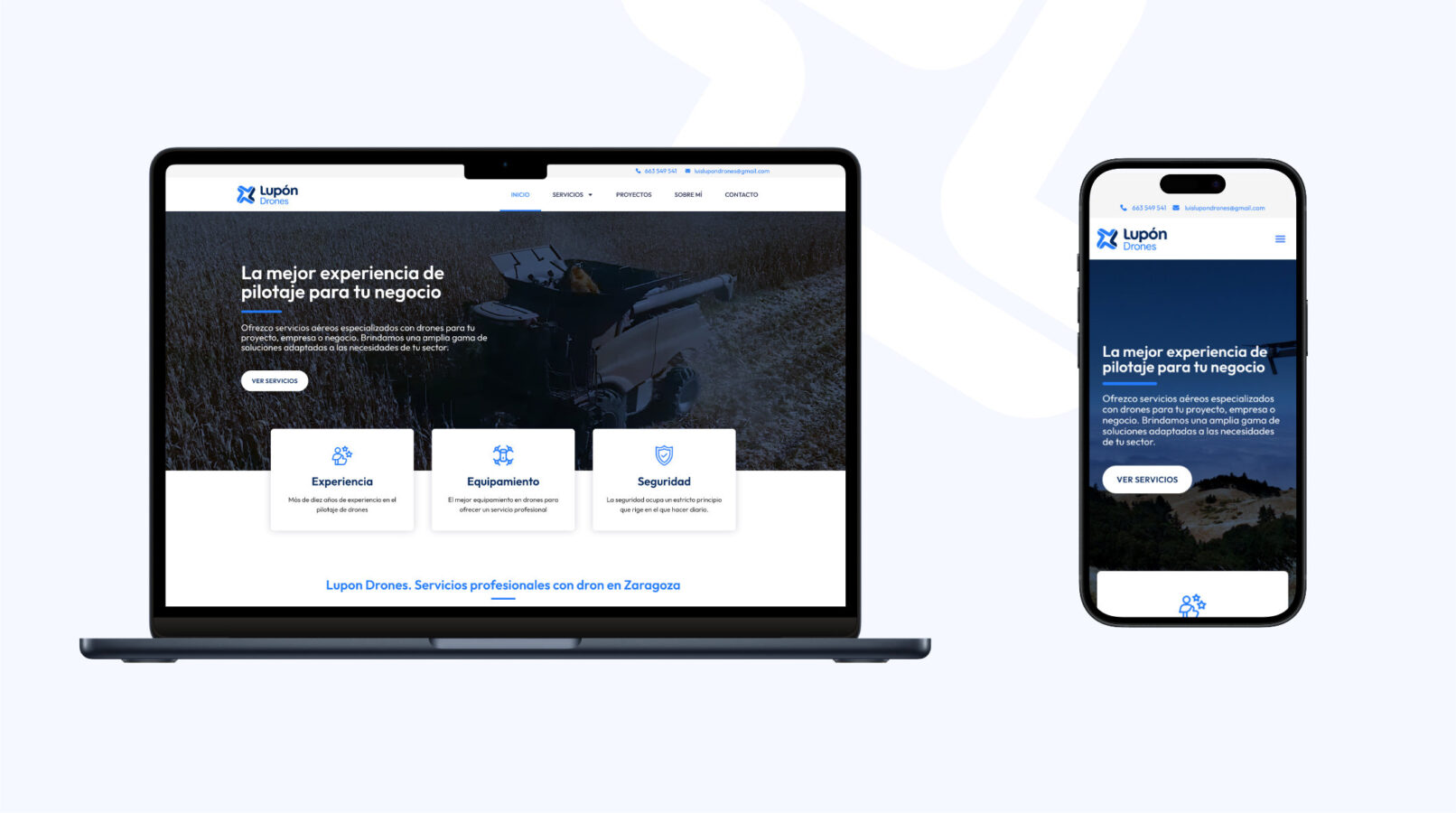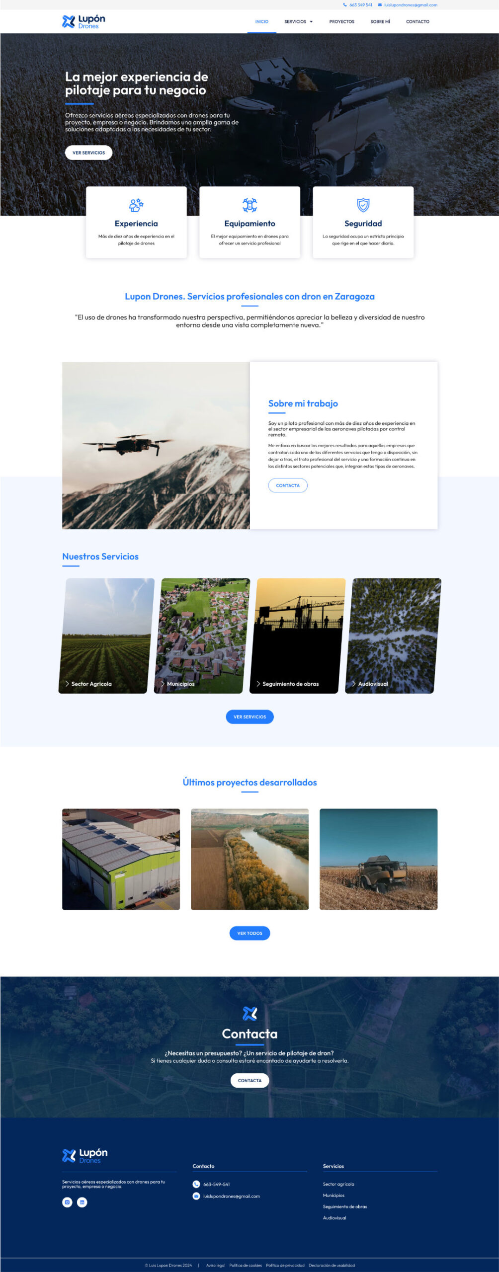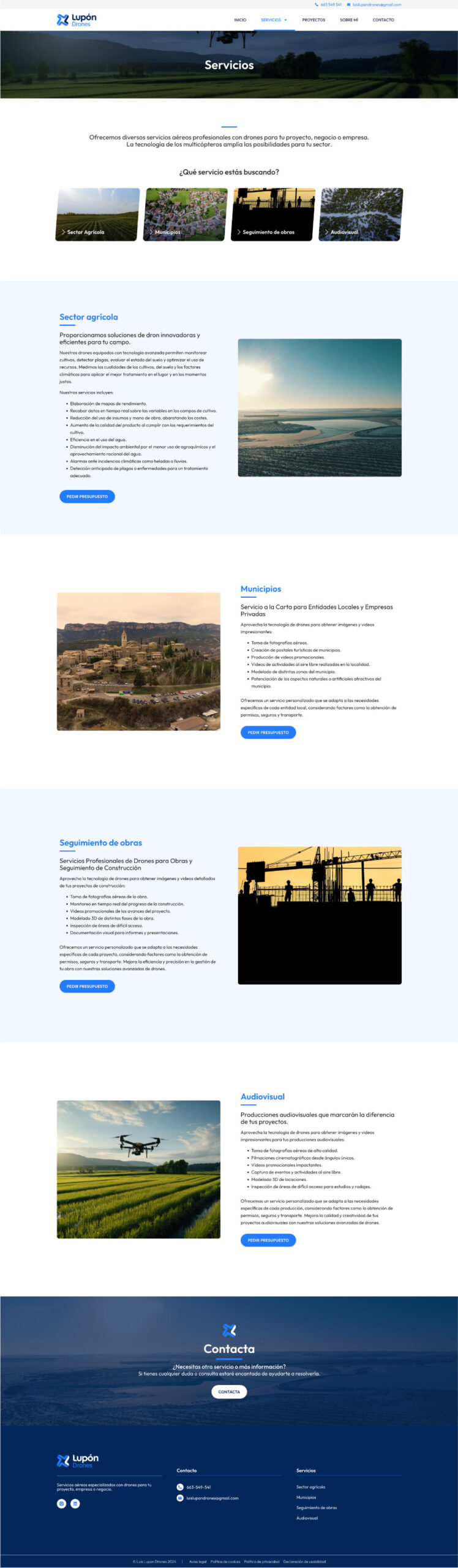 Diseño de identidad y web para Lupón Drones: Luis Lupón ofrece servicios de filmación aérea con drones, dirigidos a empresas, negocios y proyectos en sectores como la agricultura, la construcción y la producción audiovisual.